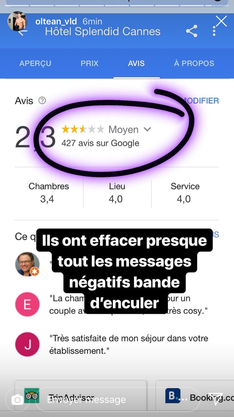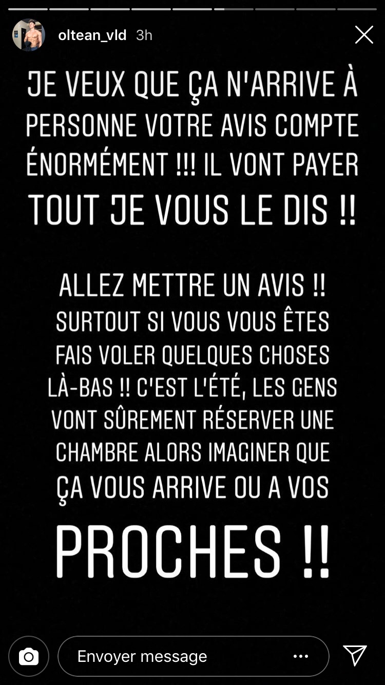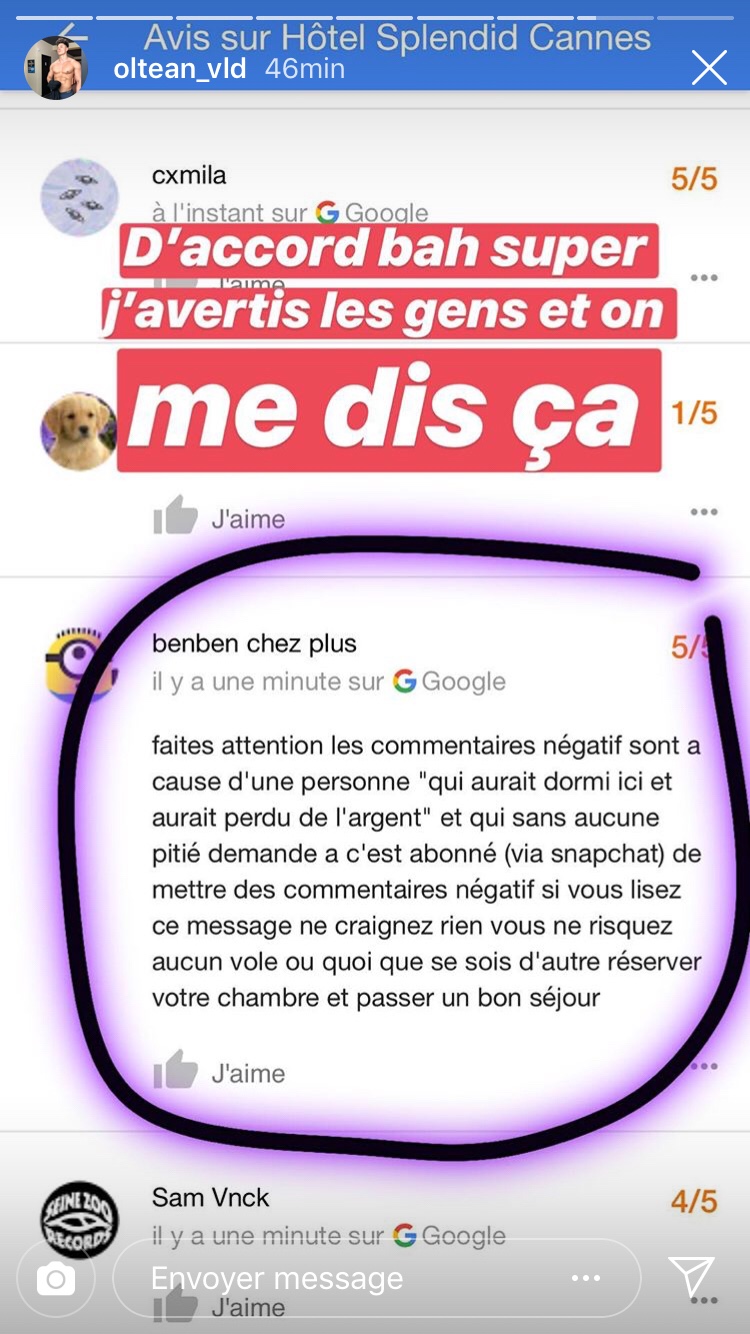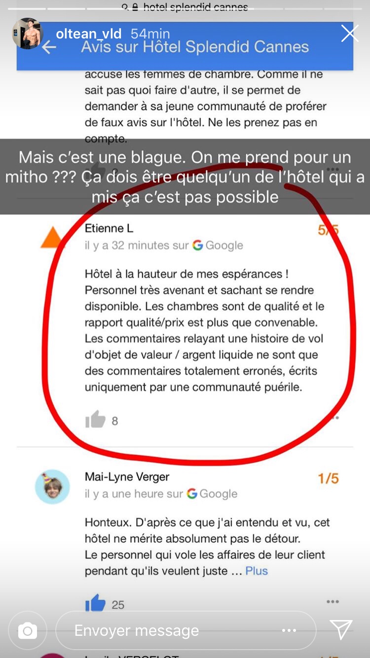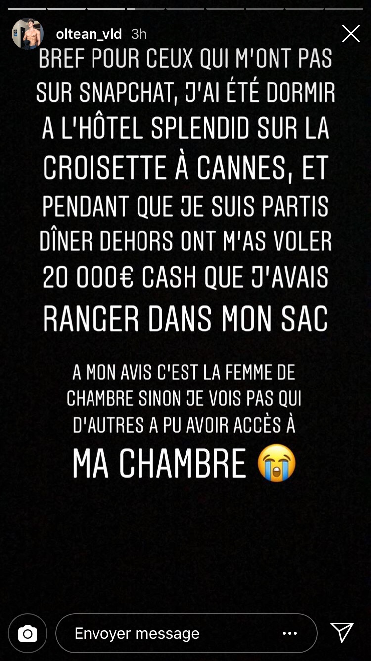 Plus récemment, et dans un autre registre, c’est Vlad Oltean qui a été beaucoup plus loin. Alors qu’il séjourne à l’hôtel Splendid à Cannes, il fait savoir en story Instagram et sur Snapchat qu’il s’est fait voler 20.000 euros dans sa chambre d’hôtel. « J’ai été dormir à l’hôtel Splendid sur la croisette à Cannes, et pendant que je suis parti dîner dehors, on m’a volé 20.000 euros cash que j’avais rangé dans mon sac », détaille-t-il. Pour régler le problème, il a appelé sa communauté à dégrader la note de l’établissement sur Internet. Contacté par mes soins, l’hôtel n’a pas confirmé les faits.