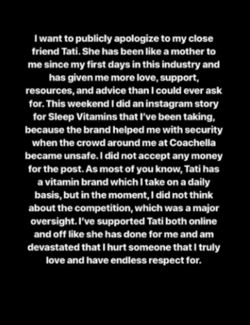 Pour sa sécurité, le jeune Américain a été épaulé par une marque de vitamines pour dormir. A la suite de quoi, il en a fait la promotion sur son compte Instagram. « Ce week-end, j’ai fait une story Instagram pour des vitamines pour dormir que j’ai prises, parce que la marque m’a aidé à être en sécurité quand la foule autour de moi à Coachella est devenue dangereuse », explique-t-il sur le réseau social.
