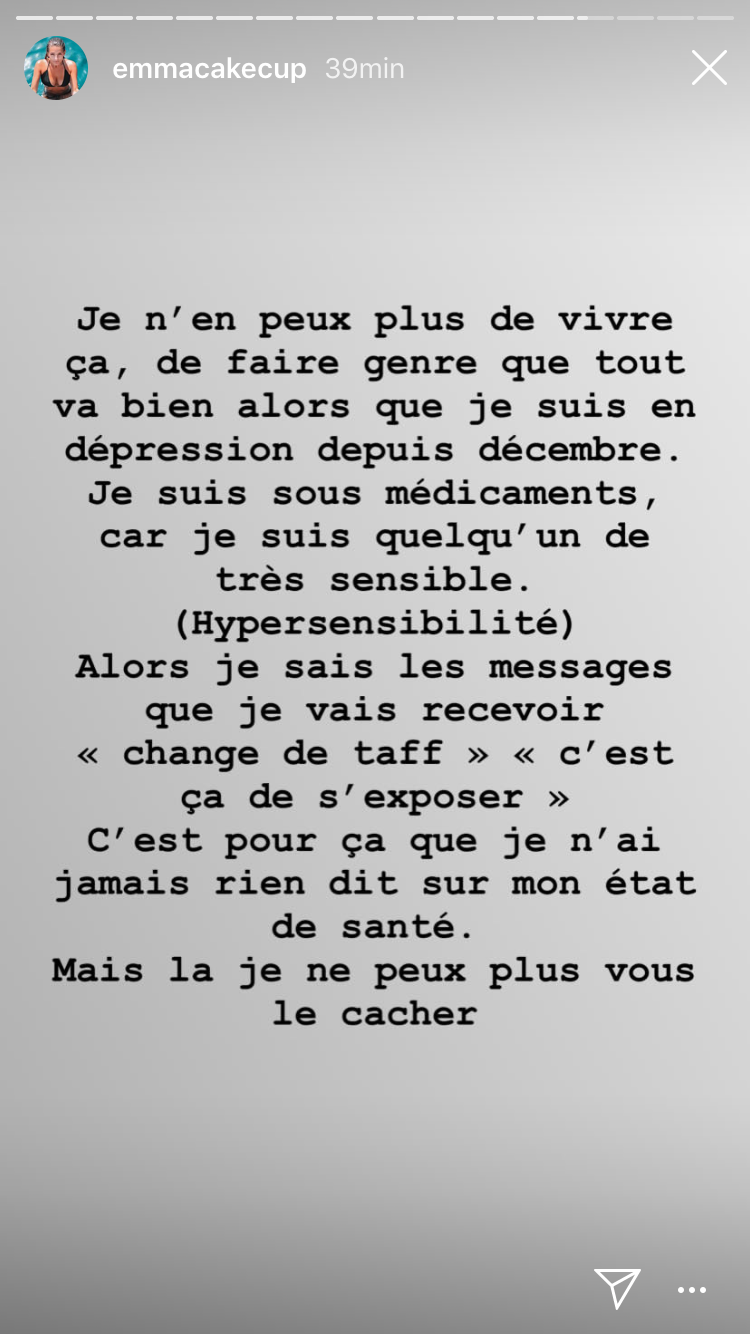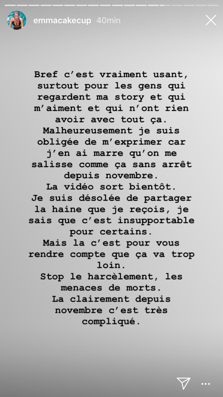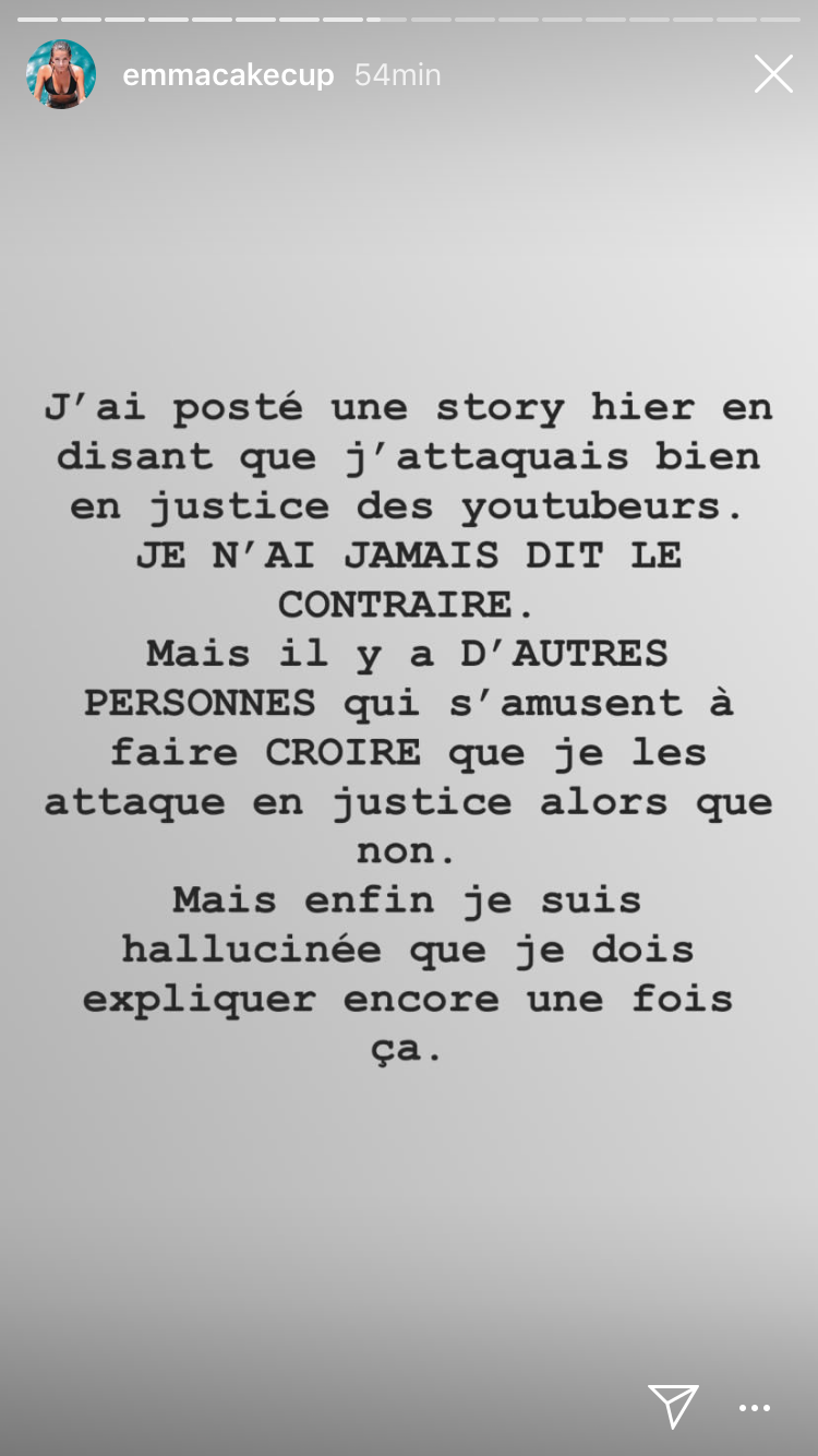 Emma poursuit ses explications. « Ca commence sérieusement à me saouler […] J’ai posté une storie hier en disant que j’attaquais bien en justice des YouTubeurs. Je n’ai jamais dit le contraire. Mais il y a d’autres personnes qui s’amusent à faire croire que je les attaque en justice alors que non », écrit-elle sur Instagram. Elle appelle donc sa communauté et ses détracteurs à stopper tout harcèlement du type menace de mots. « Là depuis novembre clairement c’est très compliqué », poursuit-elle.