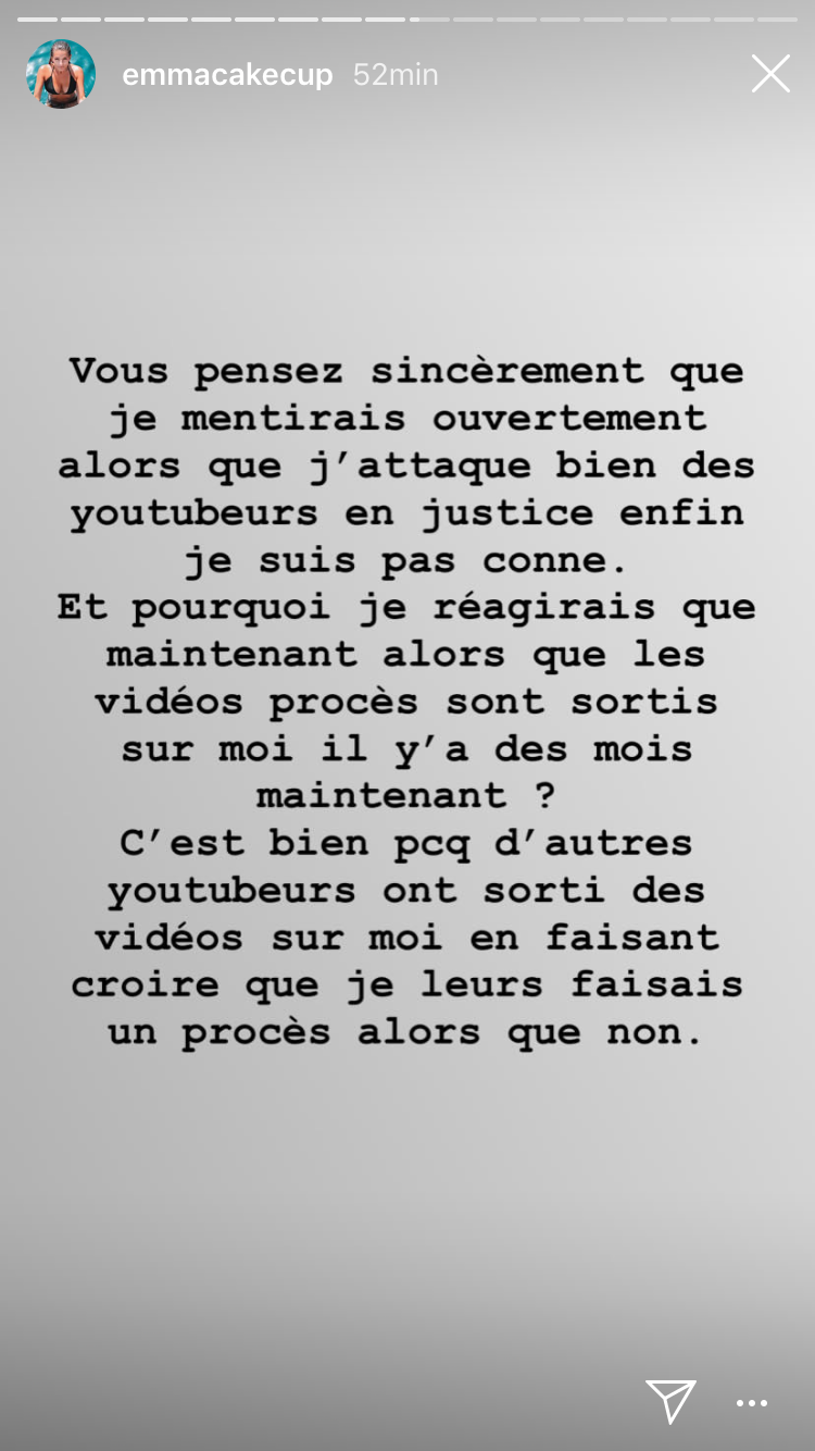 Le mercredi 22 mai dans la matinée, Emma CakeCup publie une longue storie Instagram dans laquelle elle revient sur l’affaire. La YouTubeuse débute son histoire avec la capture d’un message privé reçu sur ce même réseau social. L’auteur l’invective en lui reprochant de mentir « en disant que tu n’as fait aucun procès à un ou plusieurs YouTubeurs alors que j’ai devant moi la citation à comparaître, il y a une audience ». La goutte d’eau qui a fait déborder le vase.
